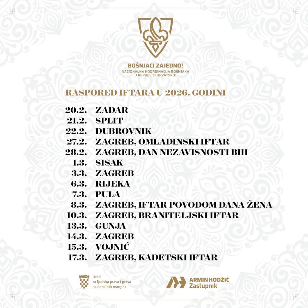 • Raspored iftara za 2026. godinu u organizaciji Nacionalne koordinacije Bošnjaka u Republici Hrvatskoj